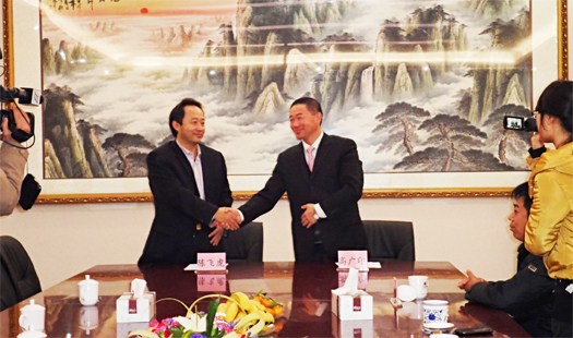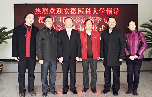 On the morning of November 30, Sun Yeheng, dean of Educational Administration from Anhui Medical University, and Chen Feihu, dean of Anhui College of Pharmacy, came to GYT to participate in Anhui Medical University teaching base listing ceremony, and both sides signed a strategic cooperation agreement on the pharmaceutical research and personnel training. Xuan Xinchang, deputy chief from Qiaocheng District of Bozhou, Gao Guangyin, president of GYT and the leaders from Anhui Medical University together unveiled for the teaching base. Dean Sun Yeheng, deputy chief Xun Xinchang and president Gao Guangyin separately delivered a warm speech.