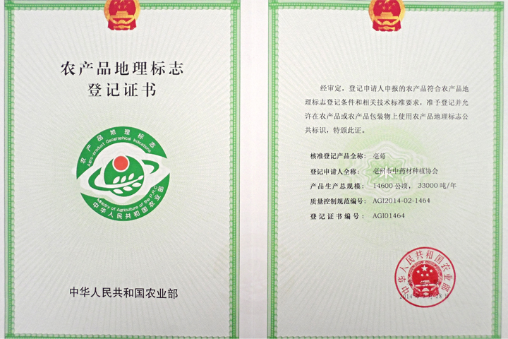 July 28, 2014, Announcement No. 2136 from the State Ministry of Agriculture, Bo chrysanthemum and other 41 products are protected in terms of national agricultural products geographical indication registration. After the first instance, expert review and public notice, in accordance with the registration process and conditions about the Agricultural Geographical Indications registration, the above are approved and awarded agricultural product geographical indications registration certificate of the People's Republic of China.