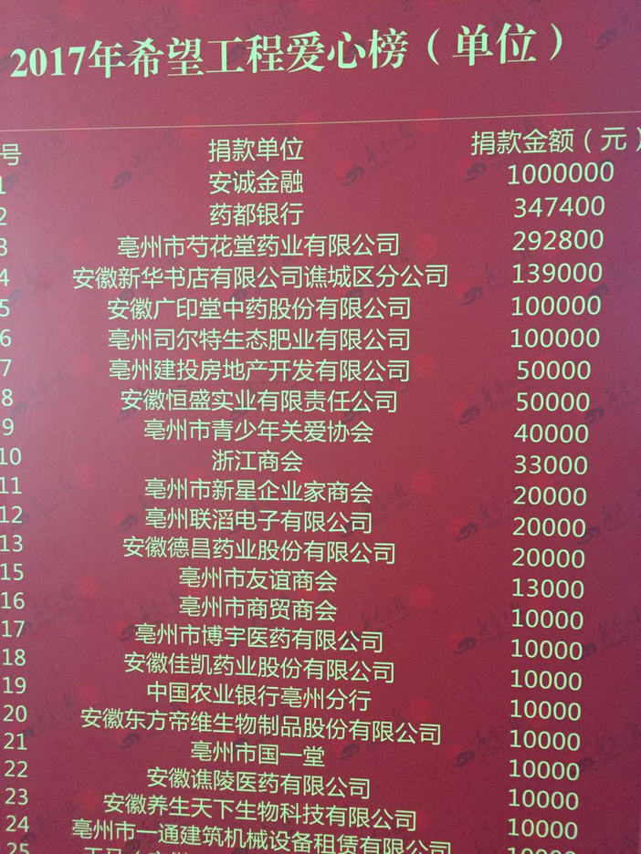 廣印堂藥業(yè)重視推動慈善,彰顯企業(yè)公民責(zé)任,近年來,舉行了一系列愛心活動,以實(shí)際行動回饋社會。在2017年亳州希望工程“圓夢大學(xué)行動”和“成長助力計(jì)劃”活動中,廣印堂藥業(yè)再獻(xiàn)愛心,資助愛心款十萬元,并再度榮獲“愛心單位”稱號。