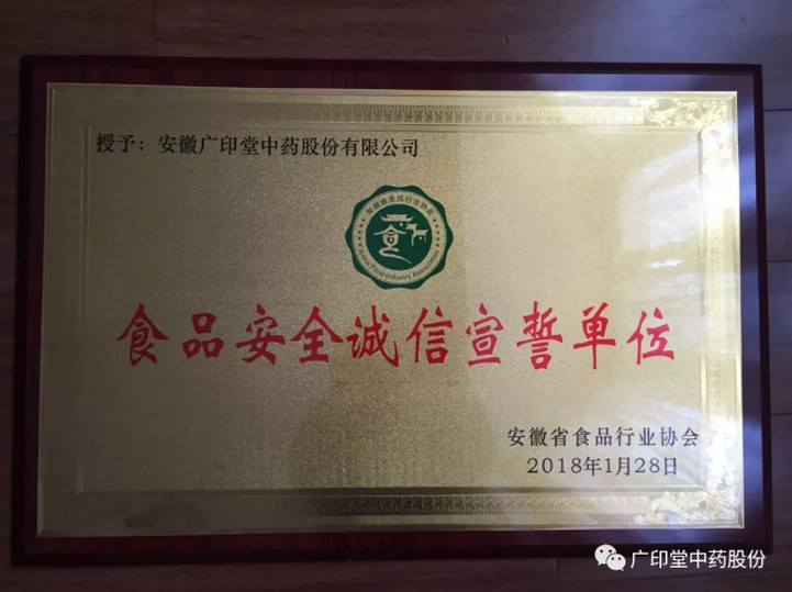 安徽省食品行業(yè)協(xié)會成立,廣印堂中藥被授予“食品安全誠信宣誓單位”稱號