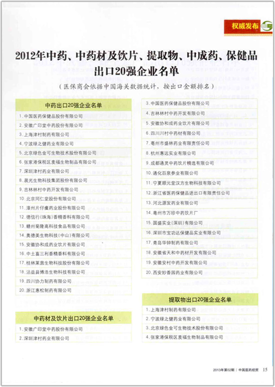 Anhui GYT Chinese Medicine Co.,Ltd was awarded 2012 annual top 20 strong enterprises in exporting Chinese herbal medicine and pieces jointly by Anhui Provincial Federation of Industry and Commerce, the provincial Commission of Economy and Information, the Provincial Department of Commerce, the provincial Trade and Industry Bureau, the Provincial Local Taxation Bureau, and the message is published in the authoritative journal