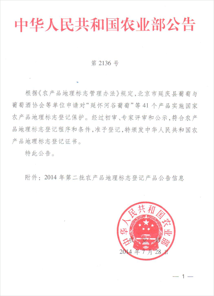 July 28, 2014, Announcement No. 2136 from the State Ministry of Agriculture, Bo chrysanthemum and other 41 products are protected in terms of national agricultural products geographical indication registration. After the first instance, expert review and public notice, in accordance with the registration process and conditions about the Agricultural Geographical Indications registration, the above are approved and awarded agricultural product geographical indications registration certificate of the People's Republic of China.