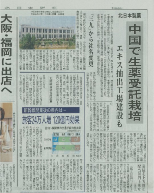 日本著名新聞報(bào)之一的《北日本新聞》6月25日在經(jīng)濟(jì)版頭條位置報(bào)導(dǎo)了廣印堂合資企業(yè)“廣印堂富山制藥(亳州)有限公司”。其內(nèi)容如下: