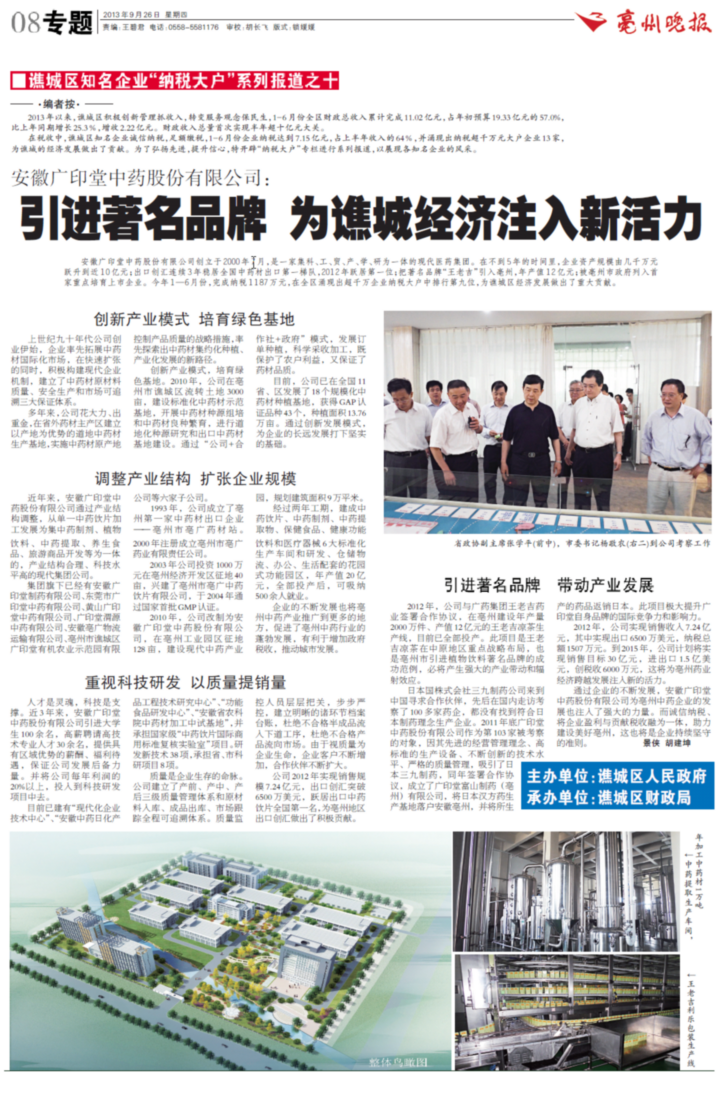 安徽廣印堂中藥股份有限公司引進著名品牌為譙城經(jīng)濟注入新活力,2013年9月26日印發(fā)的亳州晚報中開辟的題為譙城區(qū)知名企業(yè)“納稅大戶”系列報道的專欄中為此做出了專題報道。