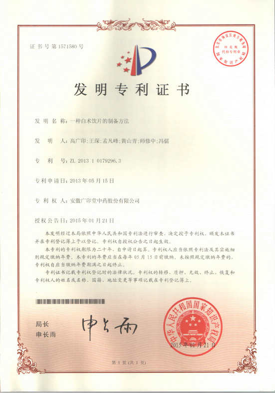 2015年1月21日,安徽廣印堂中藥股份有限公司的“一種天麻飲片的制備方法”和“一種白術(shù)飲片的制備方法”兩項(xiàng)中藥飲片制備技術(shù)通過了國家知識產(chǎn)權(quán)局的發(fā)明專利認(rèn)證,分別榮獲發(fā)明專利證書。