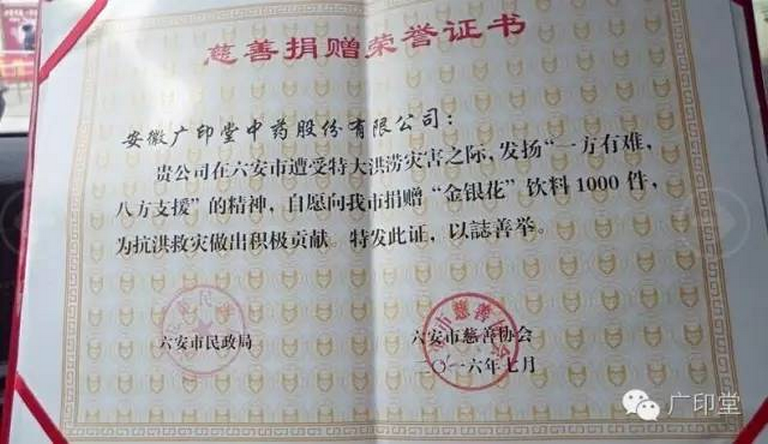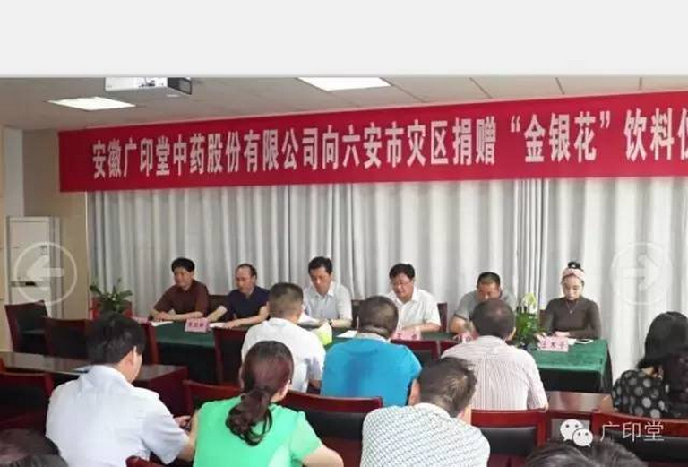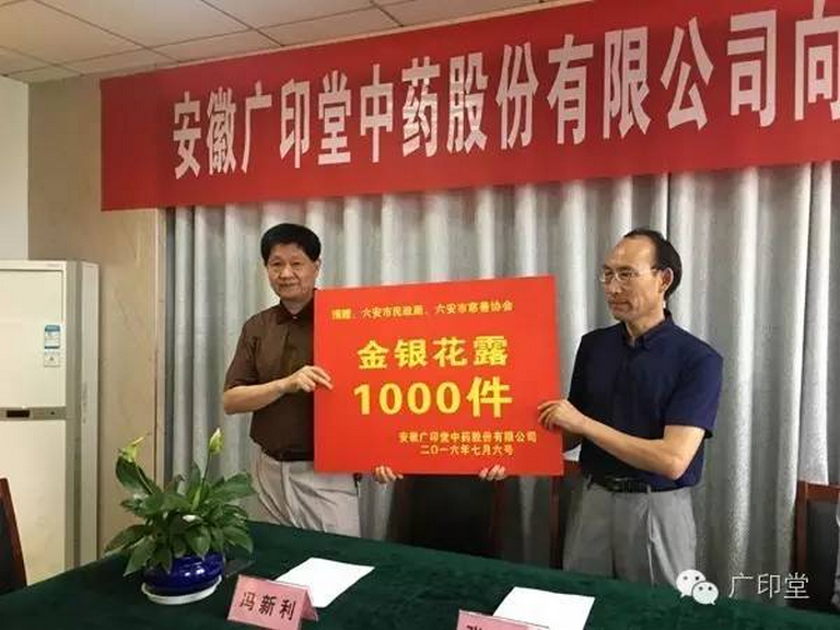 2016年7月6日上午11時(shí),安徽廣印堂中藥股份有限公司向六安市災(zāi)區(qū)捐贈(zèng)金銀花飲料儀式在六安市民政局會(huì)議室舉行。