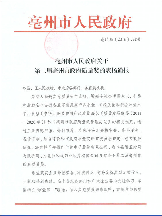熱烈祝賀安徽廣印堂中藥股份有限公司被市政府授予第二屆亳州市政府質(zhì)量獎(jiǎng)。