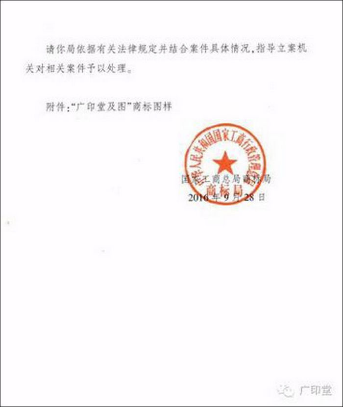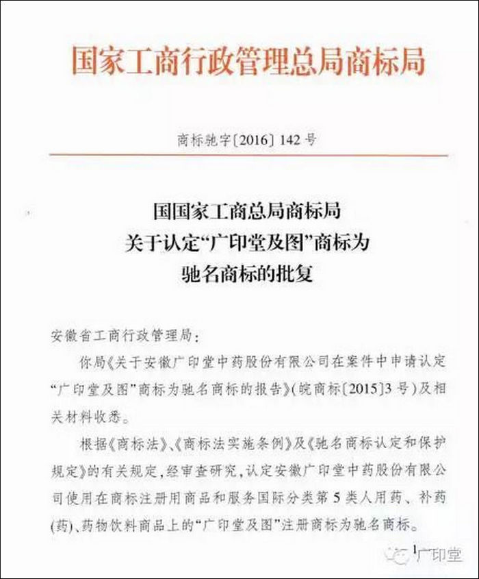 國家工商行政管理總局商標局對外權(quán)威發(fā)布:安徽廣印堂中藥股份有限公司注冊的“廣印堂”商標圖及文字被評為“中國弛名商標”最高榮譽稱號。